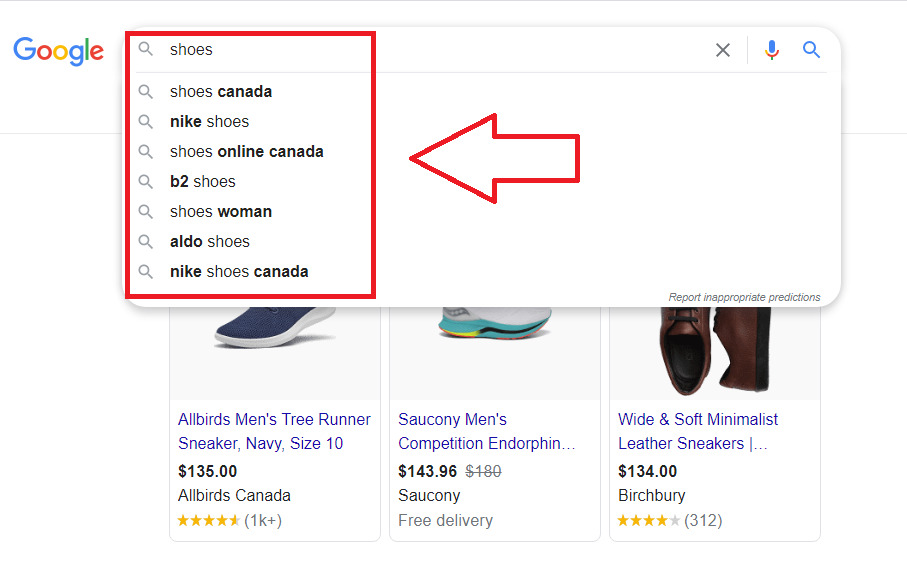 In the screenshot above, when we typed the word “Shoes” into the search engine, not only did we see branded shoes in the SERP, but Google also suggested top keywords that people commonly search for.